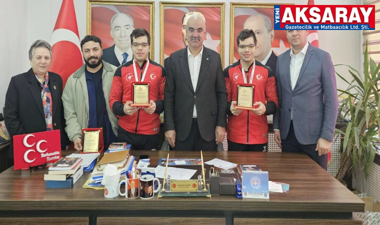 Türkiye Şampiyonu olan Aksaraylı milli sporcular İbrahim Enes Arık ve İsmail Eren Arık, MHP İl Başkanlığı’nı ziyaret etti. İl Başkanı Burhanettin Karataş, "Bu başarı Aksaray’ın gururudur" diyerek şampiyonları ödüllendirdi.