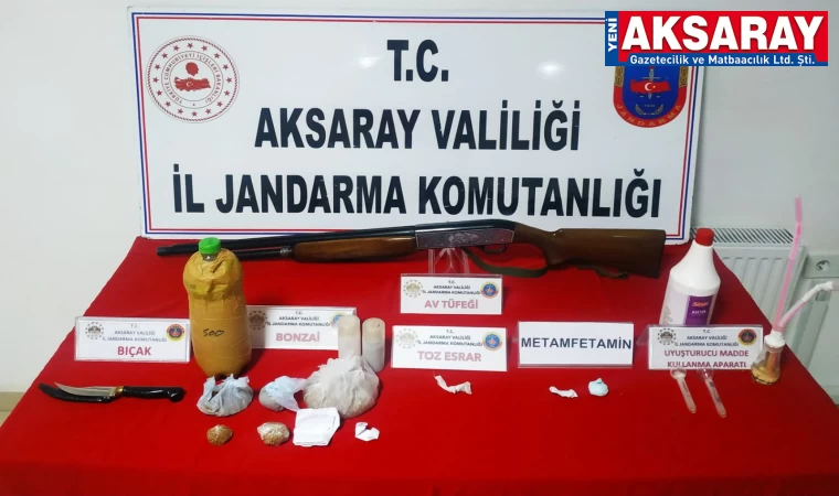 Aksaray Cumhuriyet Başsavcılığının talimatları doğrultusunda, İl Jandarma Komutanlığına bağlı İstihbarat Şube Müdürlüğü ekiplerince yapılan istihbari çalışmalar sonucunda, Uyuşturucu veya Uyarıcı Madde İmal ve Ticareti yaptığı tespit edilen (2) şahsın işyerinde ve aracında yapılan aramalarda; (820) gram sentetik cannabinoid bonzai, (12) gram metamfetamin, (5) gram kubar esrar, (1) adet ruhsatsız av tüfeği, (520) gram bonzai üretiminde kullanılan aseton, (1) adet kama bıçağı, (3) adet uyuşturucu madde kullanma aparatı ele geçirildi.