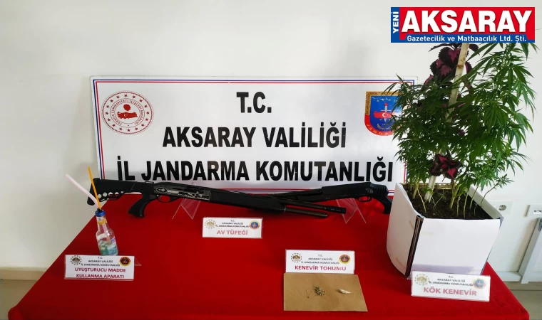 Aksaray Cumhuriyet Başsavcılığının talimatları doğrultusunda, Aksaray İl Jandarma Komutanlığına bağlı İstihbarat Şube Müdürlüğü ekiplerince yapılan istihbari çalışmalar sonucunda, yasadışı kenevir ekimi yaptığı tespit edilen bir şahsın ikametinde yapılan aramalarda; (23) kök kenevir bitkisi, (2) adet ruhsatsız av tüfeği, (5) gram kenevir tohumu, (1) adet uyuşturucu veya uyarıcı madde kullanma aparatı ele geçirildi.