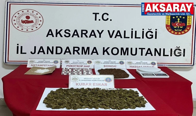 Şüphelinin Aksaray merkezdeki ikametine düzenlenen operasyonda şahıs kıskıvrak yakalanırken, evde yapılan detaylı aramalarda yüklü miktarda uyuşturucu madde ele geçirildi: 98 adet sentetik ecza, 185 gram bonzai, 221 gram kubar esrar, 12 gram metamfetamin, 1 adet hassas terazi.